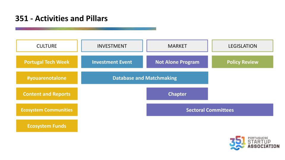 351 Portuguese Startup Association’s vision is to enable Portugal’s startup ecosystem to be a globally renowned hub of innovation, with rapid growth, vibrant collaboration, and sustainable founder success. To reach that vision, we work everyday supporting startup founders in every stage of their growth and connecting ecosystem players